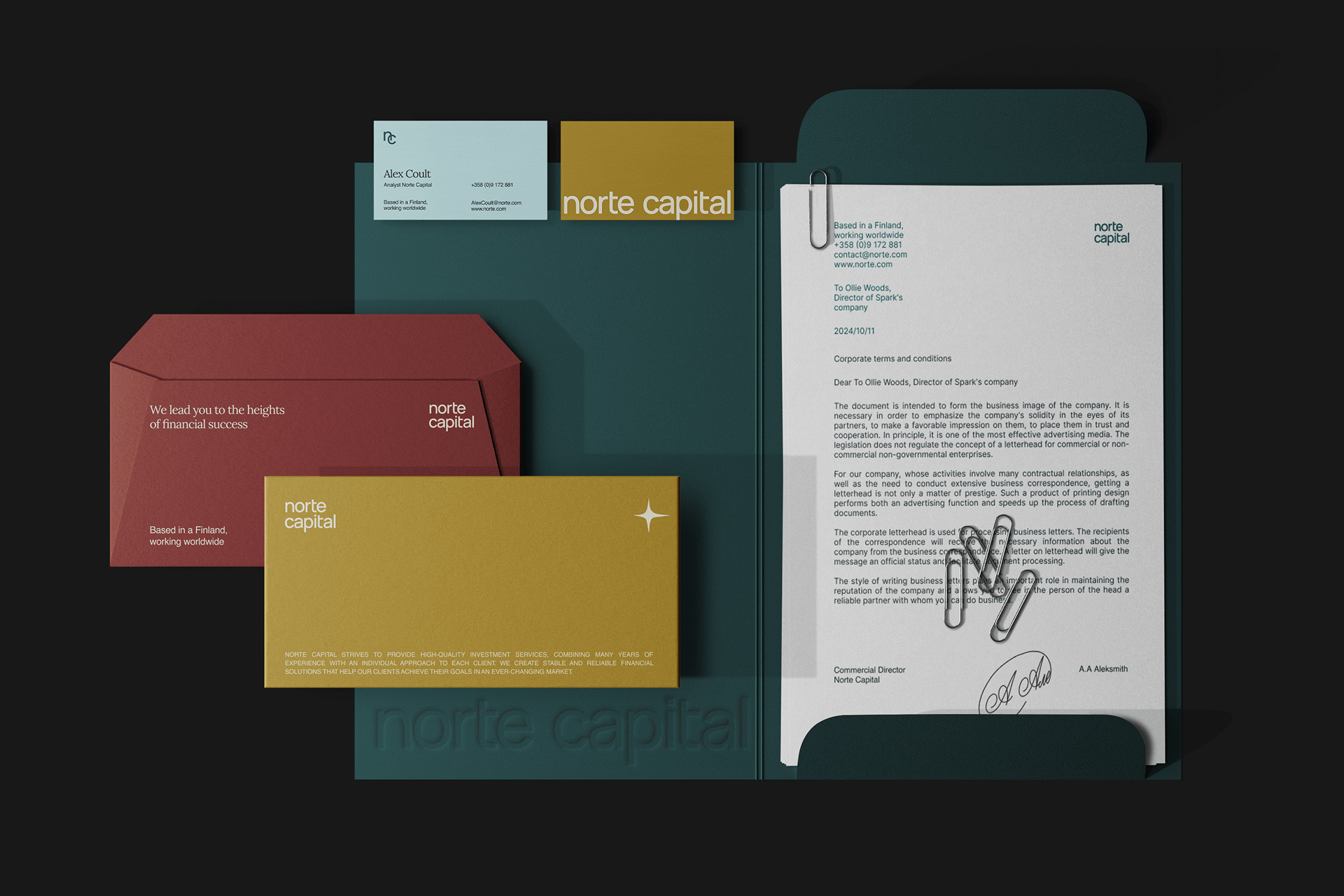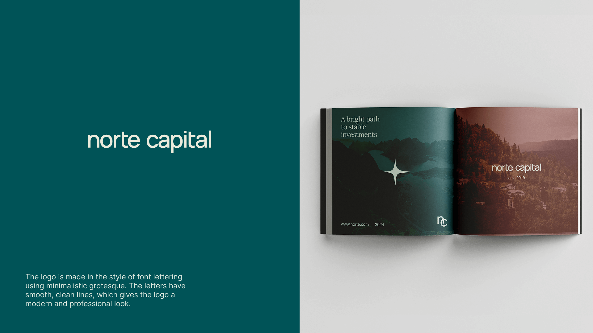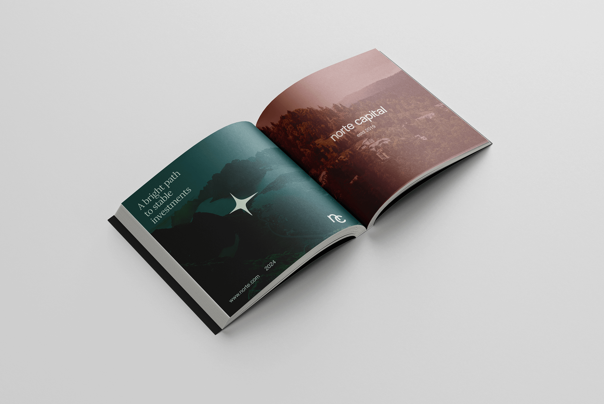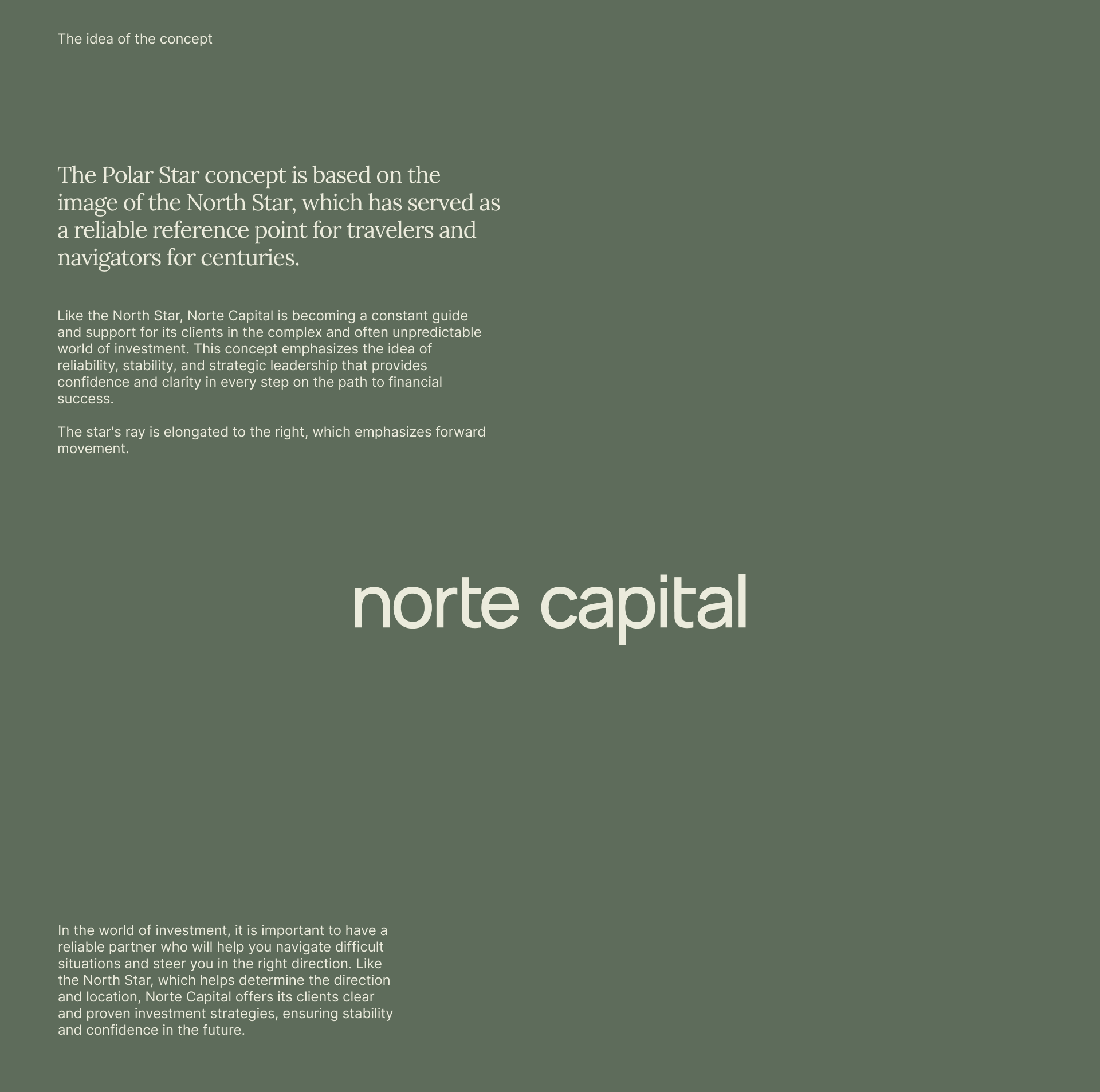 Разработан уникальный фирменный стиль для инвестиционной компании Norte Capital®. Основой концепции стал образ Полярной звезды, символизирующей стабильность и стратегическое лидерство на рынке инвестиций. В проекте использованы два шрифта: Helvetica® для основного текста и Lora® для акцентных заголовков, что создает гармоничный баланс между профессионализмом и элегантностью. Цветовая палитра, включающая золотые, зеленые и терракотовые оттенки, подчеркивает премиальность, надёжность и долгосрочные отношения с клиентами. Проект визуализирует ценности компании через минималистичные, но мощные графические элементы, отражающие стратегический подход к инвестированию.