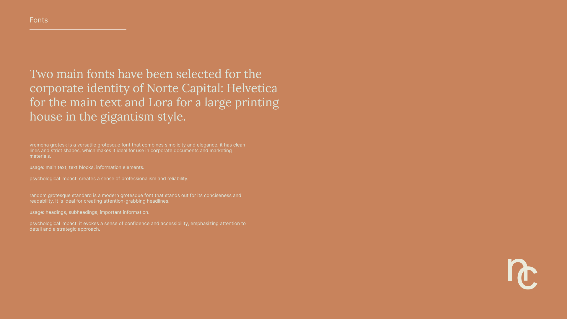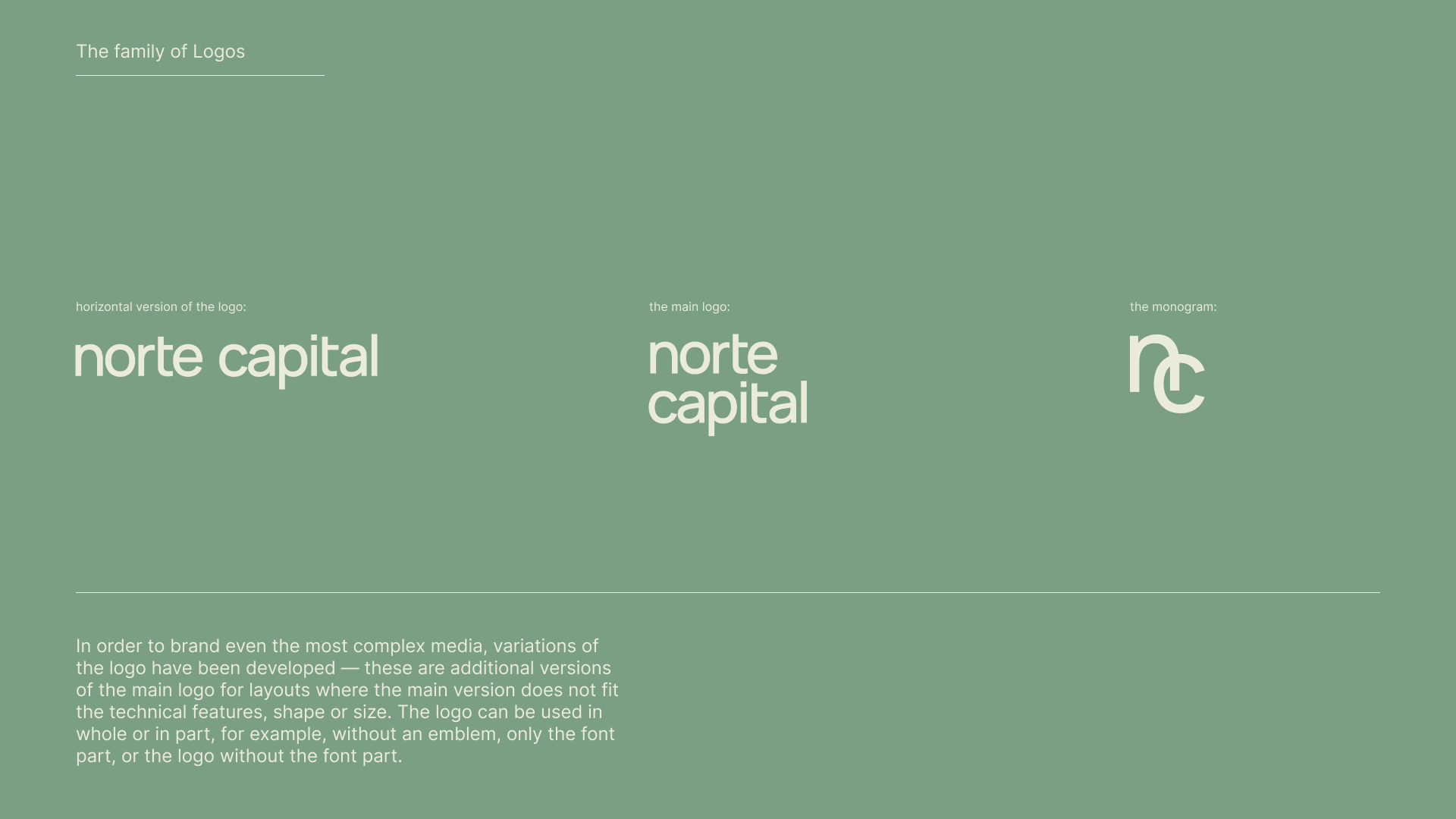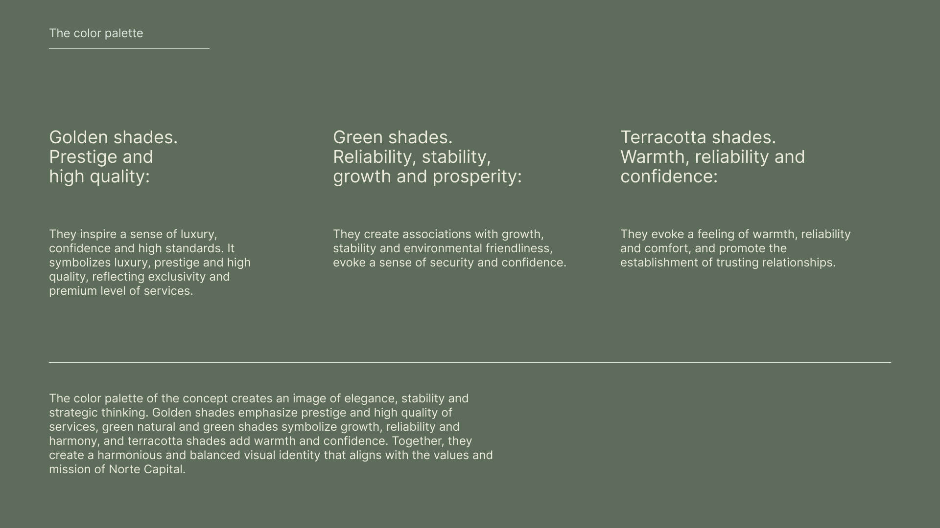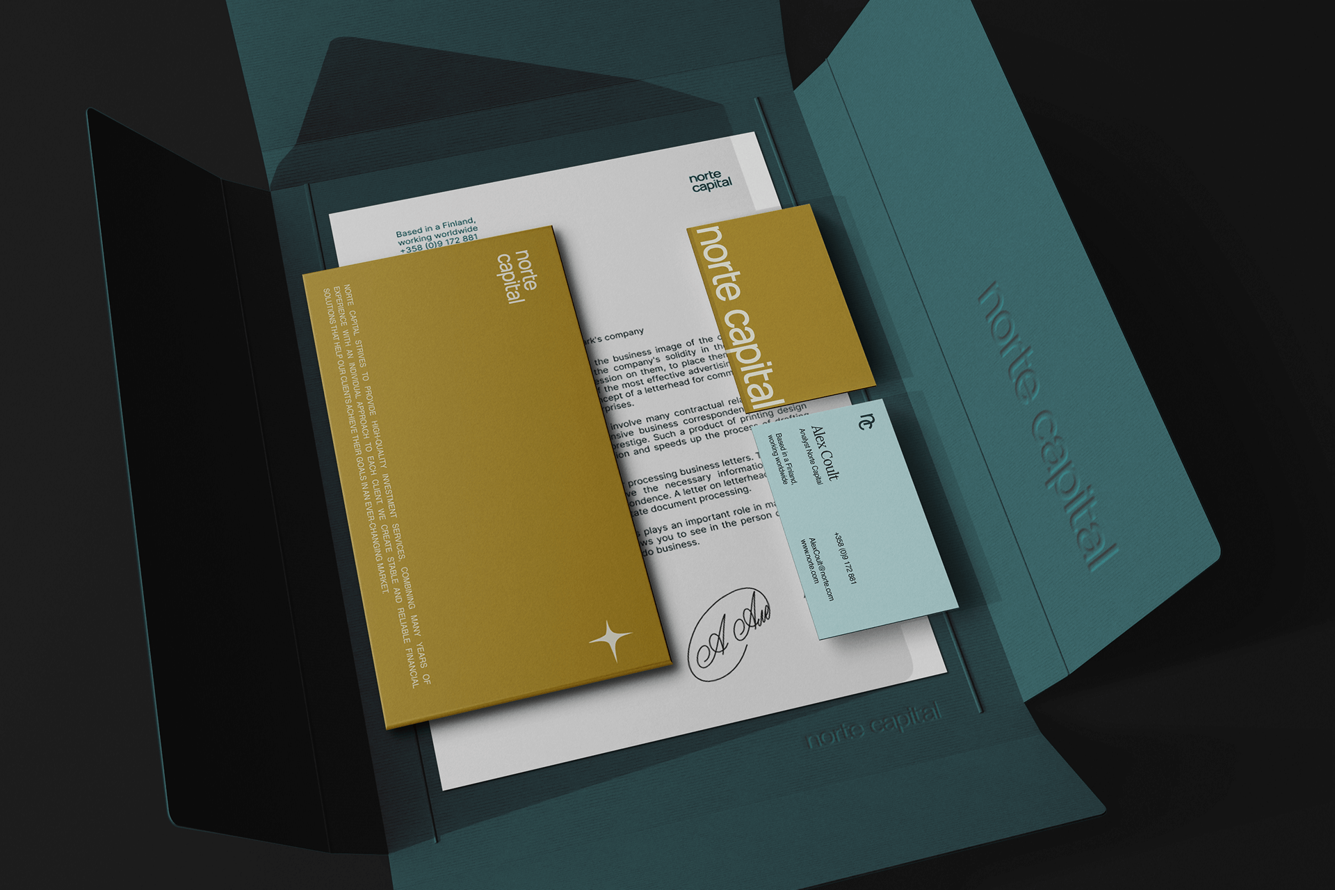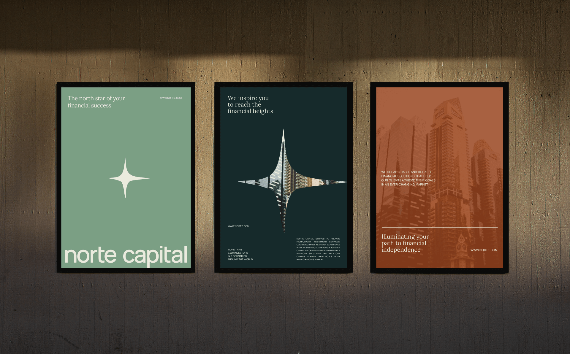 Разработан уникальный фирменный стиль для инвестиционной компании Norte Capital®. Основой концепции стал образ Полярной звезды, символизирующей стабильность и стратегическое лидерство на рынке инвестиций. В проекте использованы два шрифта: Helvetica® для основного текста и Lora® для акцентных заголовков, что создает гармоничный баланс между профессионализмом и элегантностью. Цветовая палитра, включающая золотые, зеленые и терракотовые оттенки, подчеркивает премиальность, надёжность и долгосрочные отношения с клиентами. Проект визуализирует ценности компании через минималистичные, но мощные графические элементы, отражающие стратегический подход к инвестированию.